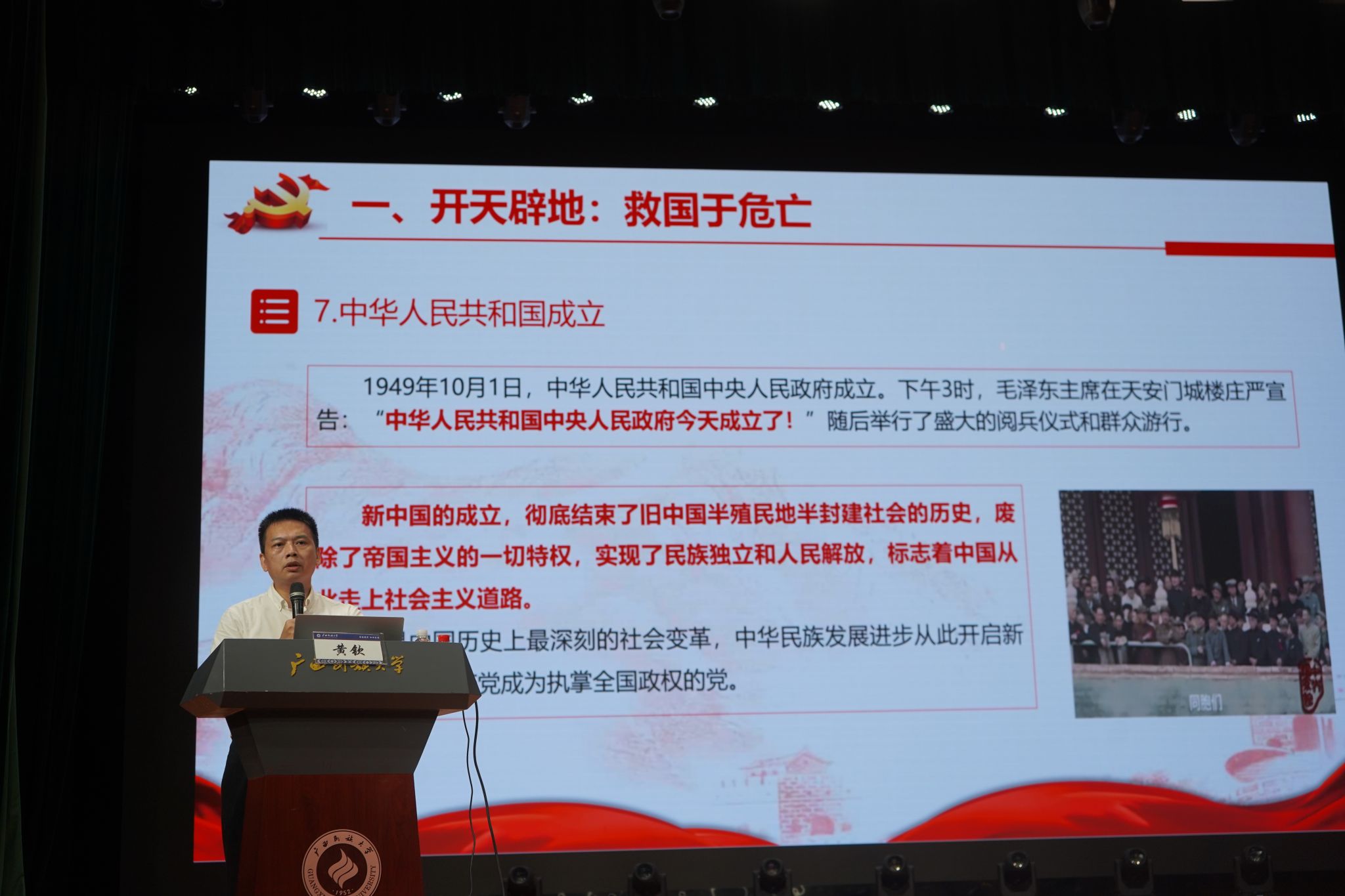 讲座上,黄钦从“光辉历程:苦难辉煌中的使命担当”“初心如磐:中国共产党的立党之本与时代使命”“时代召唤:大学生入党的意义与条件”“筑梦启航:大学期间的入党行动指南”四个方面展开教育。黄钦表示,一代人有一代人的长征,一代人有一代人的担当。新时代中国青年要坚定走好新时代的长征路。作为新时代的大学生应该紧跟时代步伐,以时代的新要求来要求自己,积极争取加入中国共产党。