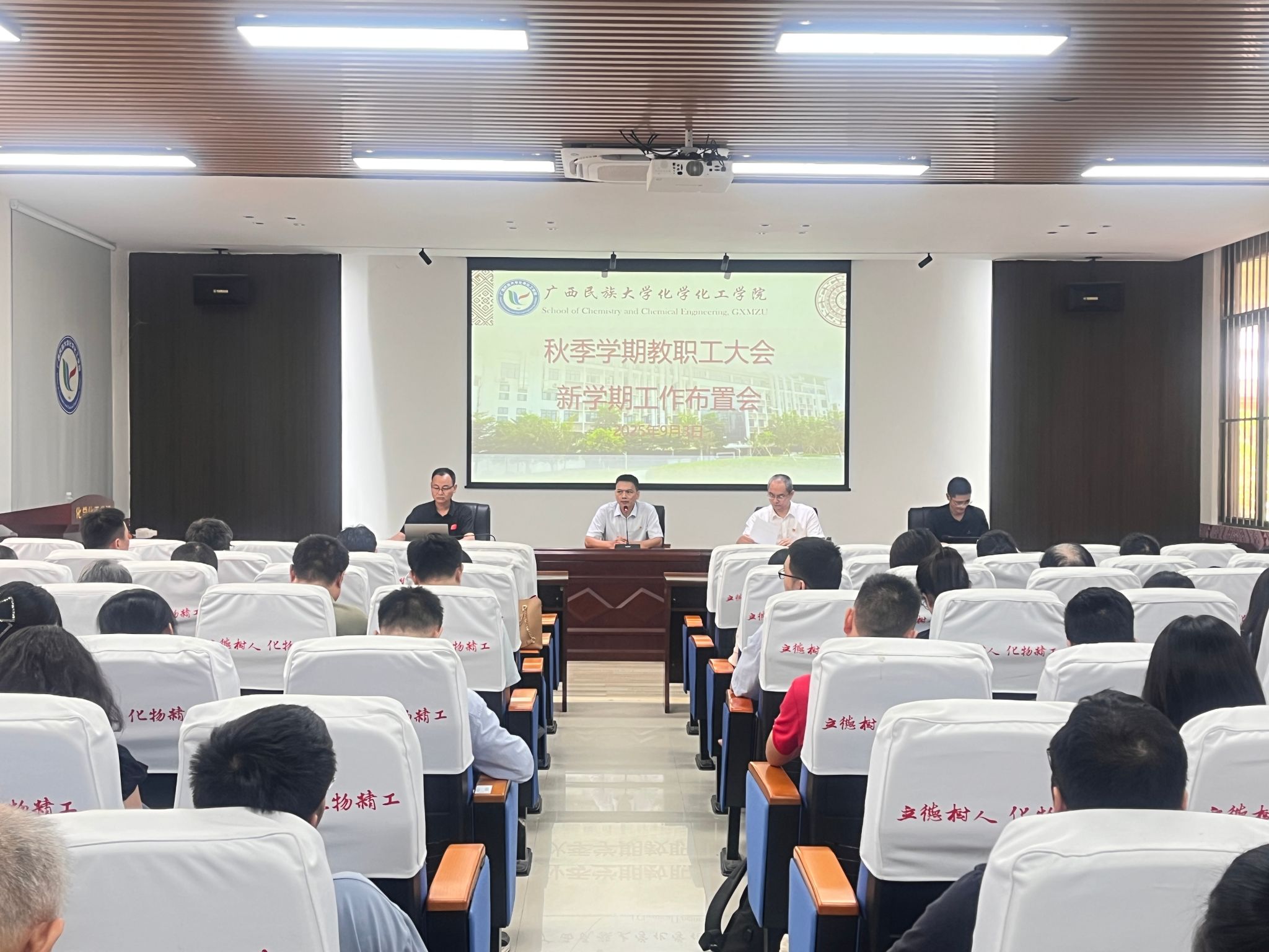 9月3日上午,化学化工学院在扬帆楼109会议室召开2025年秋季学期工作布置会。学院党委书记黄钦,院长刘绍刚,副书记刘前程、院长助理杜方凯及全体教职工参加会议。会议由黄钦主持。