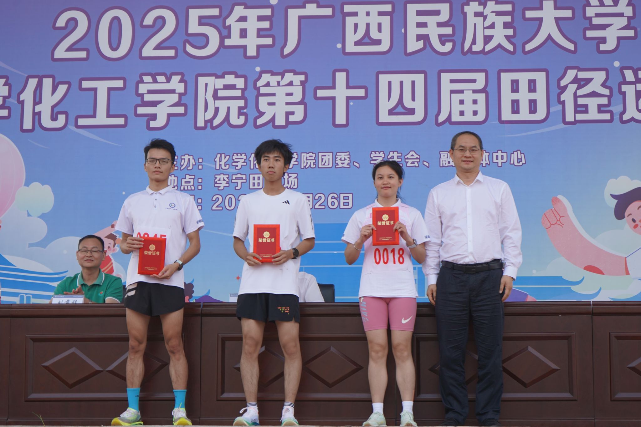 运动会结束,我院领导对取得优异成绩的同学和班级进行颁奖。其中,2024级能源化学工程3班、2023级应用化学2班、2025级化学1班分别获得团体积分第一名、第二名和第三名的好成绩。