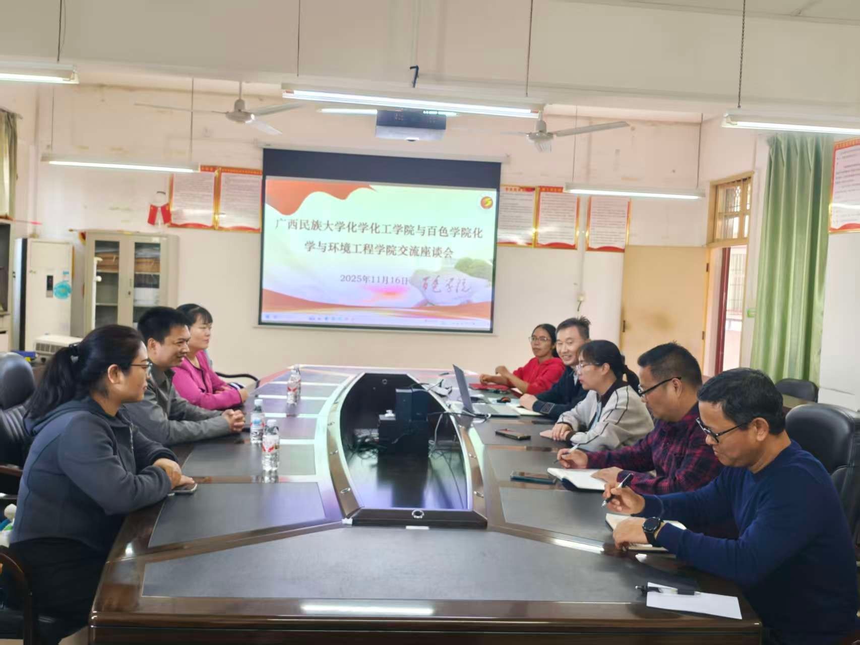 2025年11月16日下午,广西民族大学化学化工学院党委书记黄钦、创新创业学院副院长王飒飒一行4人赴百色学院化学与环境工程学院进行交流。百色学院党委常委、副校长刘芳会见黄钦一行,化学与环境工程学院院长李勇刚等参加了本次座谈交流。