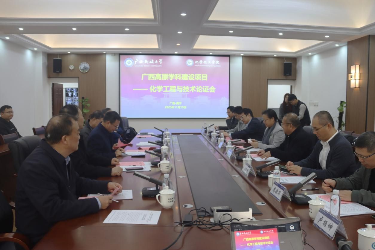 11月19日上午,中国科学院院士、原国务院学科评议组成员彭孝军,国务院学科评议组成员刘大斌、梁志武、张正国、崔鹏到我院401会议室开展关于化学工程与技术广西高原学科建设项目论证会,其余专家线上参加此次论证会。我校党委副书记、校长韦仕珍,副校长姜明国、高兴宇,我院党委书记黄钦,院长刘绍刚,及其他教师代表出席此论证会。会议由高兴宇主持。