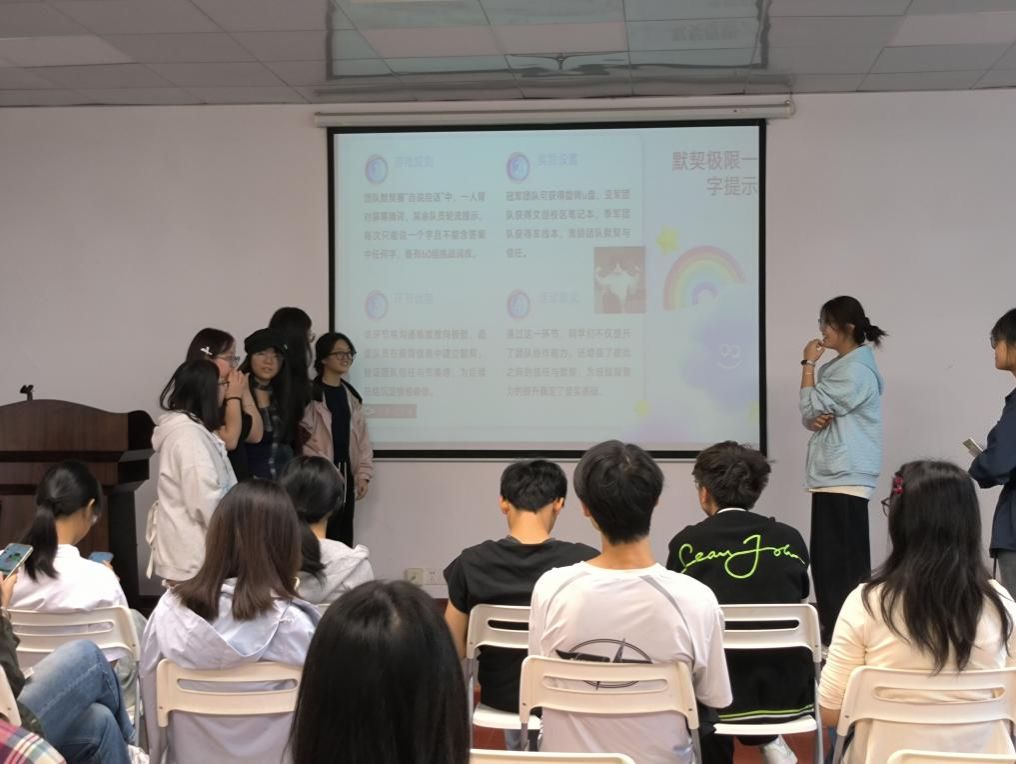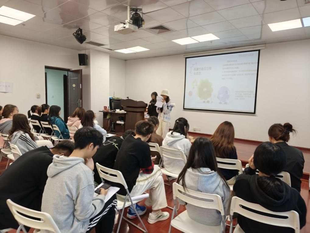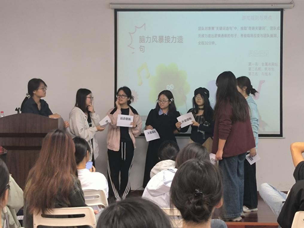 第二场活动聚焦“学业压力解构、学业压力释放”,通过多元互动帮助同学们拆解压力、释放情绪。听歌识曲单人赛中,经典金曲、影视OST片段引发共鸣,猜对学生获小礼品。你画我猜组队赛里,5组团队通过简笔画猜“成语”“团队词汇”,默契配合中活跃氛围。关键词强制造句与“自说自话”游戏,让大家围绕“外星人”“会说话的猫”等趣味关键词编故事、猜词语,在创意表达与团队协作中释放压力,现场笑声不断。