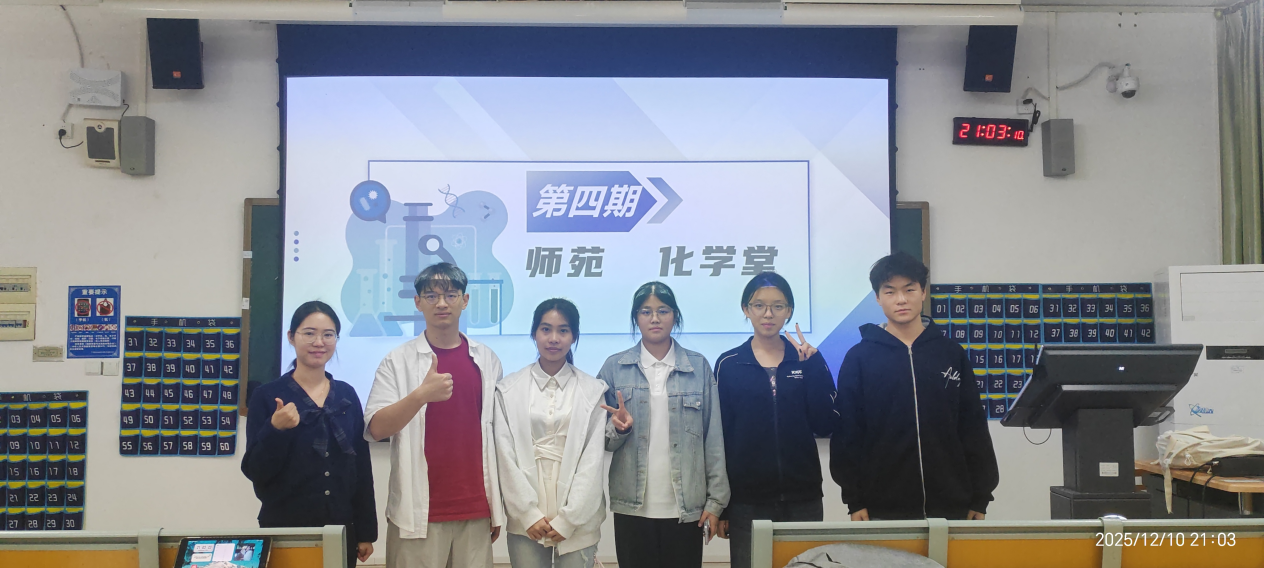 为持续推动党建与师范生培养深度融合,切实发挥学生党支部在专业成长中的引领作用,12月10日,第四期“师苑化学堂”活动在明德楼125教室开展。本期活动聚焦高中化学“课堂引入技巧”。2025级化学师范专业赵鑫颖、杨赵微、罗佳艳担任主讲,本科生第二党支部书记施瑜及2023级郑佳乐、韦雪白同学到场指导并参与互动。