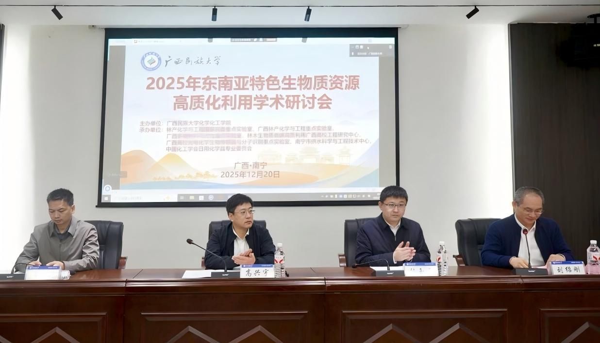 12月20日,2025年东南亚生物质资源高质化利用学术研讨会在广西民族大学化学化工学院举行。广西民族大学副校长高兴宇出席会议。来自中国林业科学研究院林产化学工业研究所化所、南京林业大学、浙江工业大学、广西大学、南宁师范大学、广西科技大学等高校院所的专家学者齐聚一堂。开幕式由化学化工学院院长刘绍刚主持。