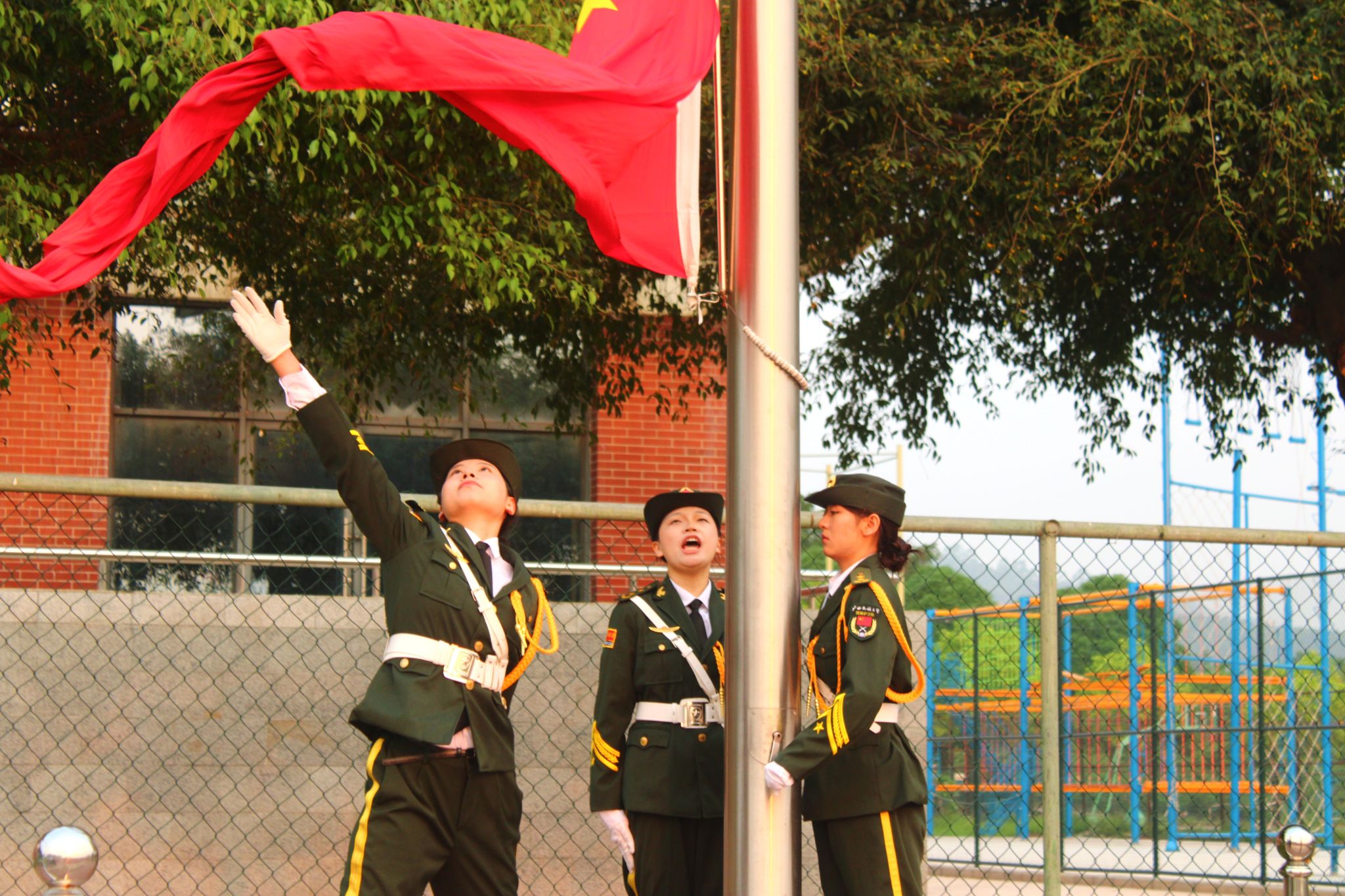 仪式现场,全体师生庄严肃立,雄壮的国歌声中,五星红旗迎着晨光冉冉升起。升旗仪式后,学院朗诵团带来主题朗诵《薪火传化工 青春耀华章》。